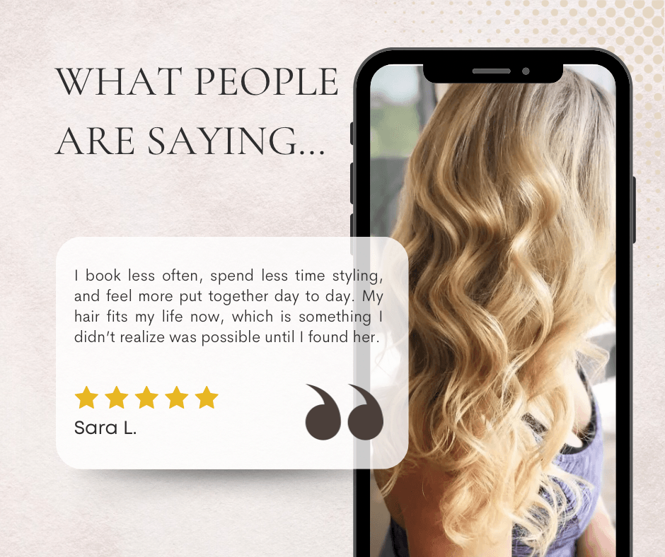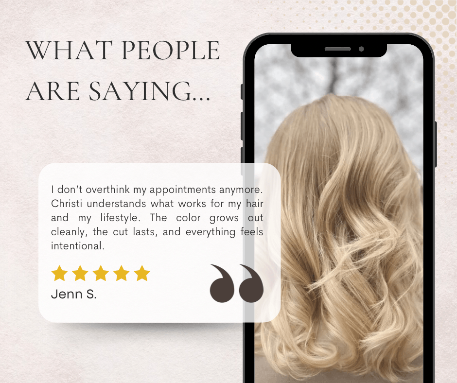 Low maintenance color is about creating hair that grows out gracefully, so you look polished long after you leave the salon. I design every color to work with your natural hair pattern, skin tone, and lifestyle, which means fewer touch-ups, less time in the chair and more time enjoying your hair.